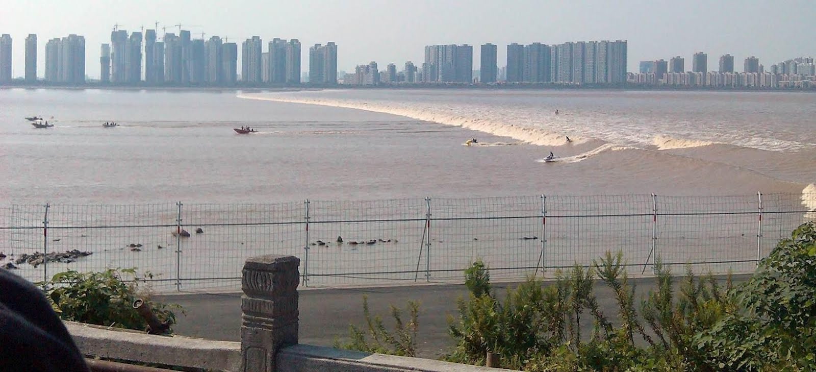 Także raz w roku na jednej z chińskich rzek (Qiantang River) możliwy jest surfing, tym razem płynąc z nurtem, a właściwie długą falą (wsteczna fala pływowa - tidal bore). Fala osiąga maksymalnie nawet do 9 m wysokości i prędkość do 40 km/h.