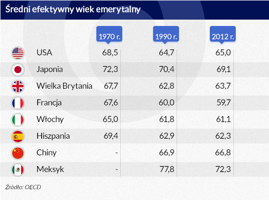Co ciekawe, średni efektywny wiek przechodzenia na emeryturę (czyli zaprzestanie pracy zarobkowej) w wielu krajach wcale nie rośnie od dziesiatek lat. Oficjalny "wiek emerytalny" może i rośnie, ale w praktyce jednak zazwyczaj i tak kończymu pracę w wieku około 65-70 lat: